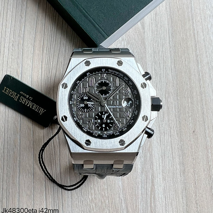 A pulseira do relógio super clone máquina ETA Audemars Piguet Royal Oak Offshore é feita de couro cinza, adicionando um toque de elegância e sofisticação ao design geral do relógio.