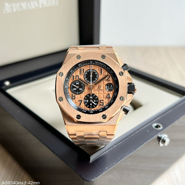 Por fim, o cristal de safira à prova de arranhões e a caixa de aço inoxidável sólido banhada a ouro rosa 18K fazem do Audemars Piguet Royal Oak Offshore 42mm um relógio durável e resistente que pode ser usado em qualquer ocasião.