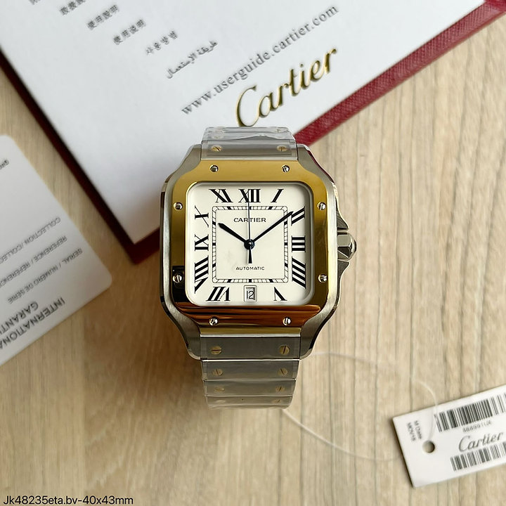 Relógio Super Clone Máquina ETA Cartier Santos Prata Dourado Branco 43mm + Pulseira Couro