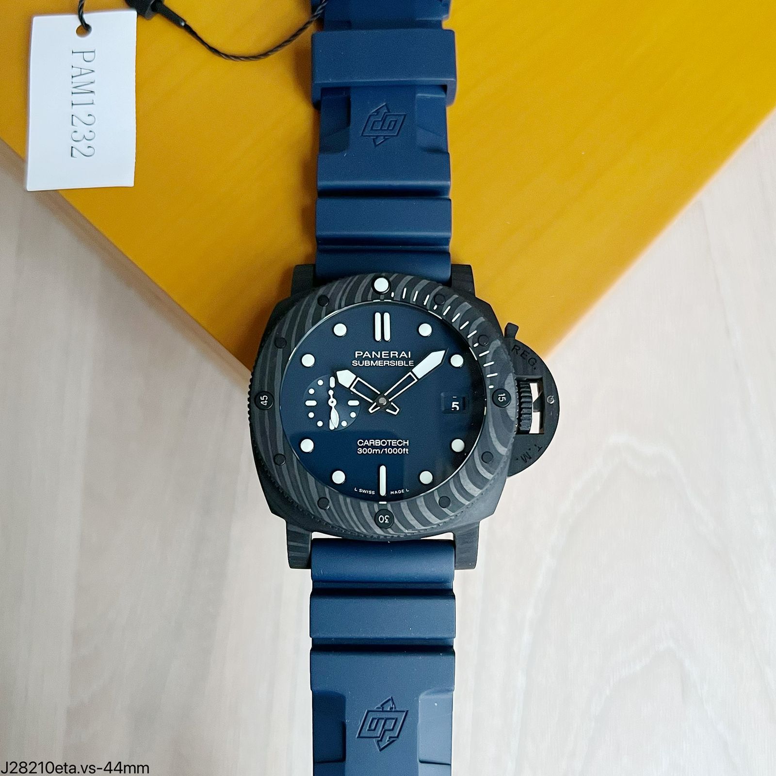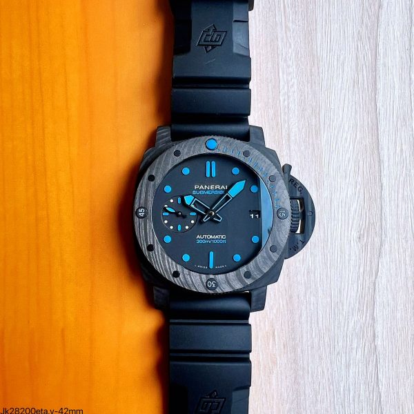 A caixa de carbotech atualizada, a guarda da coroa e a moldura são feitas do mesmo material da Panerai Carbotech, proporcionando um padrão único em cada caixa. A moldura de carbotech rotativa unidirecional adiciona um toque de sofisticação ao design.
