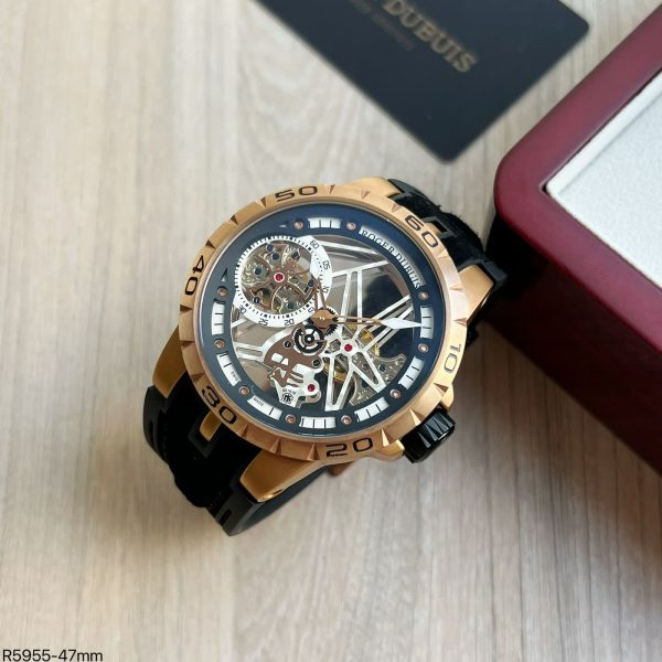 O Relógio Réplica Roger Dubuis apresenta um design contemporâneo, com uma caixa de aço inoxidável de 47 mm que garante durabilidade e resistência. Sua pulseira em couro legítimo proporciona conforto e elegância, enquanto o fecho deployant reforça a segurança e praticidade ao usar.