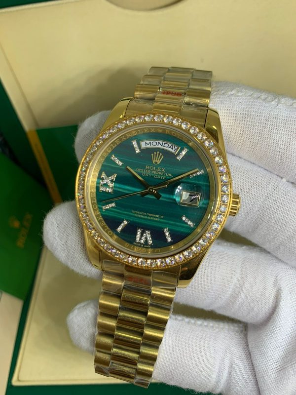 Com design moderno e atemporal, o Rolex Presidente Day Date é ideal para qualquer ocasião, combinando perfeitamente com todos os estilos e looks. Esse modelo é confeccionado com materiais de alta qualidade, incluindo aço inoxidável no mostrador e pulseira, proporcionando resistência e durabilidade ao produto. Seu fecho deployant oferece conforto e segurança no uso diário, garantindo que o relógio permaneça firmemente no pulso.