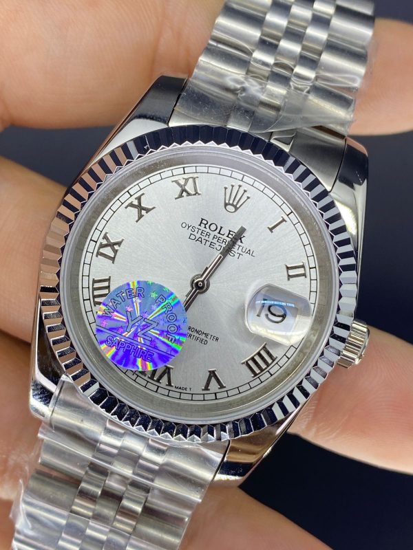 Com seu design moderno e despojado, este relógio replica de forma excepcional o estilo e as características do Rolex Date Just. O diâmetro da caixa de 36 mm proporciona um visual equilibrado e sofisticado, perfeito tanto para ocasiões formais quanto para o uso no dia a dia. A pulseira e a caixa em aço inoxidável oferecem uma aparência robusta e elegante, ao mesmo tempo em que garantem resistência.