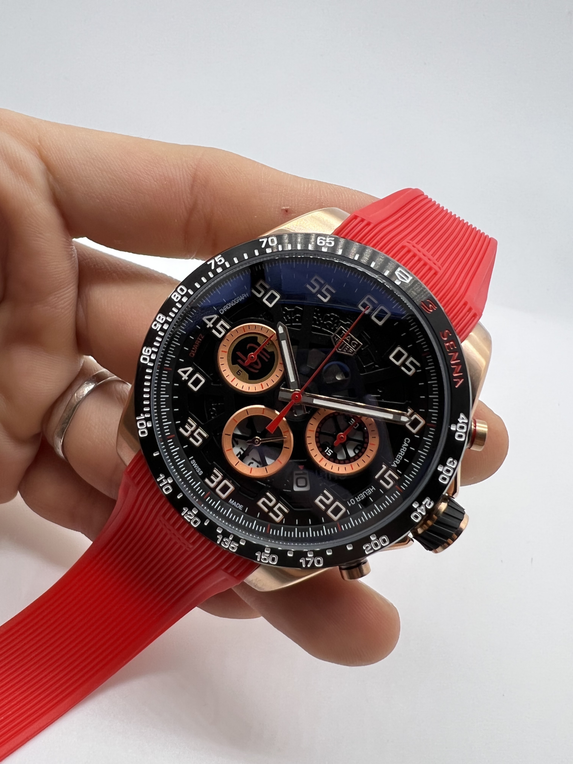 Com caixa de aço de 44 mm e pulseira em borracha durável, este relógio proporciona conforto e segurança ao usuário. Ideal para quem busca um relógio resistente, a Réplica Tag Heuer Senna é à prova d’água, suportando profundidades de até 100 metros. O fecho deployant garante um ajuste seguro e prático, facilitando o uso no dia a dia.