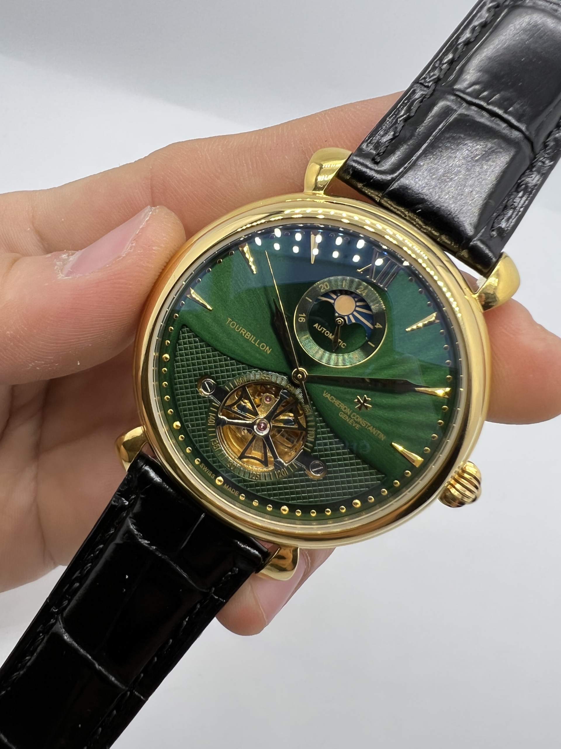 O Relógio Réplica Vecheron é fiel ao design original, com caixa de aço inoxidável de 48 mm de diâmetro, o que garante durabilidade e resistência. A pulseira de couro adiciona um toque de sofisticação e conforto, tornando-o ideal para uso prolongado. O fecho deployant, conhecido por ser prático e seguro, permite que você coloque e retire o relógio com facilidade e segurança. O vidro de safira Top Premium AAA resiste a riscos e oferece alta visibilidade, mantendo o visual impecável por mais tempo. Cada detalhe desta réplica foi pensado para reproduzir a aparência e a sensação de um Vecheron original.