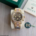 A caixa do relógio é feita de aço inoxidável 904L, um material amplamente reconhecido por sua resistência à corrosão e durabilidade. Para aumentar o toque de luxo, essa caixa é banhada a ouro amarelo, tornando o visual ainda mais sofisticado. O destaque fica por conta da moldura cravejada com brilhantes, que adiciona um brilho espetacular ao modelo, transformando-o em uma joia exclusiva para colecionadores exigentes.